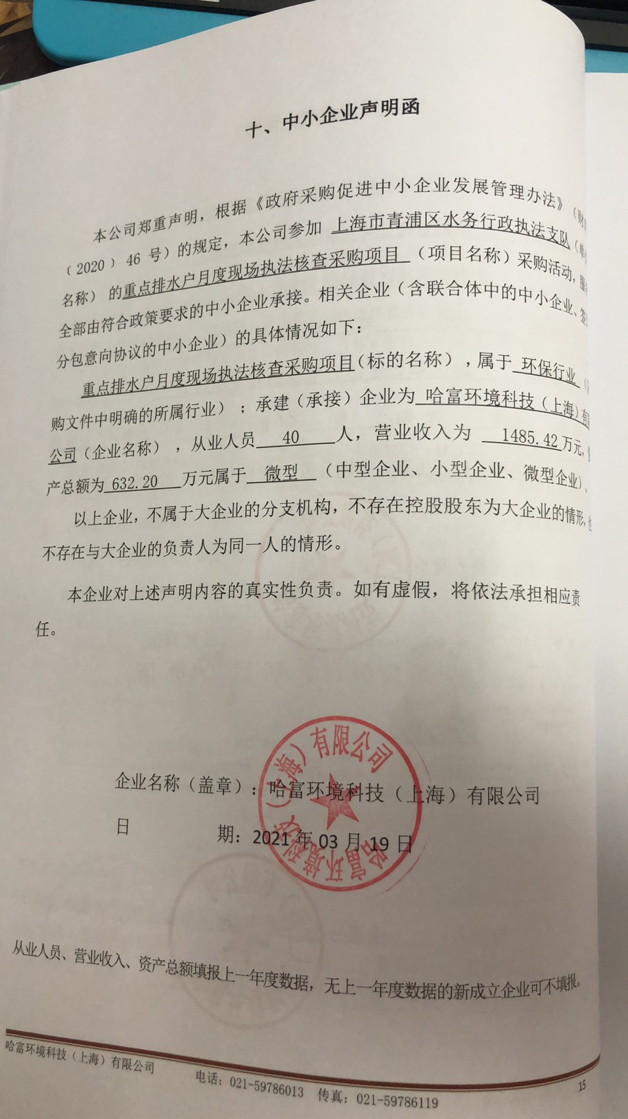 序号 标项名称 中标(成交金额) 中标供应商名称 中标供应商地址 1 重点排水户月度现场执法核查采购项目 ***.00元 哈富环境科技(上海)有限公司 上海市青浦区新科路588号4楼 四、主要标的信息