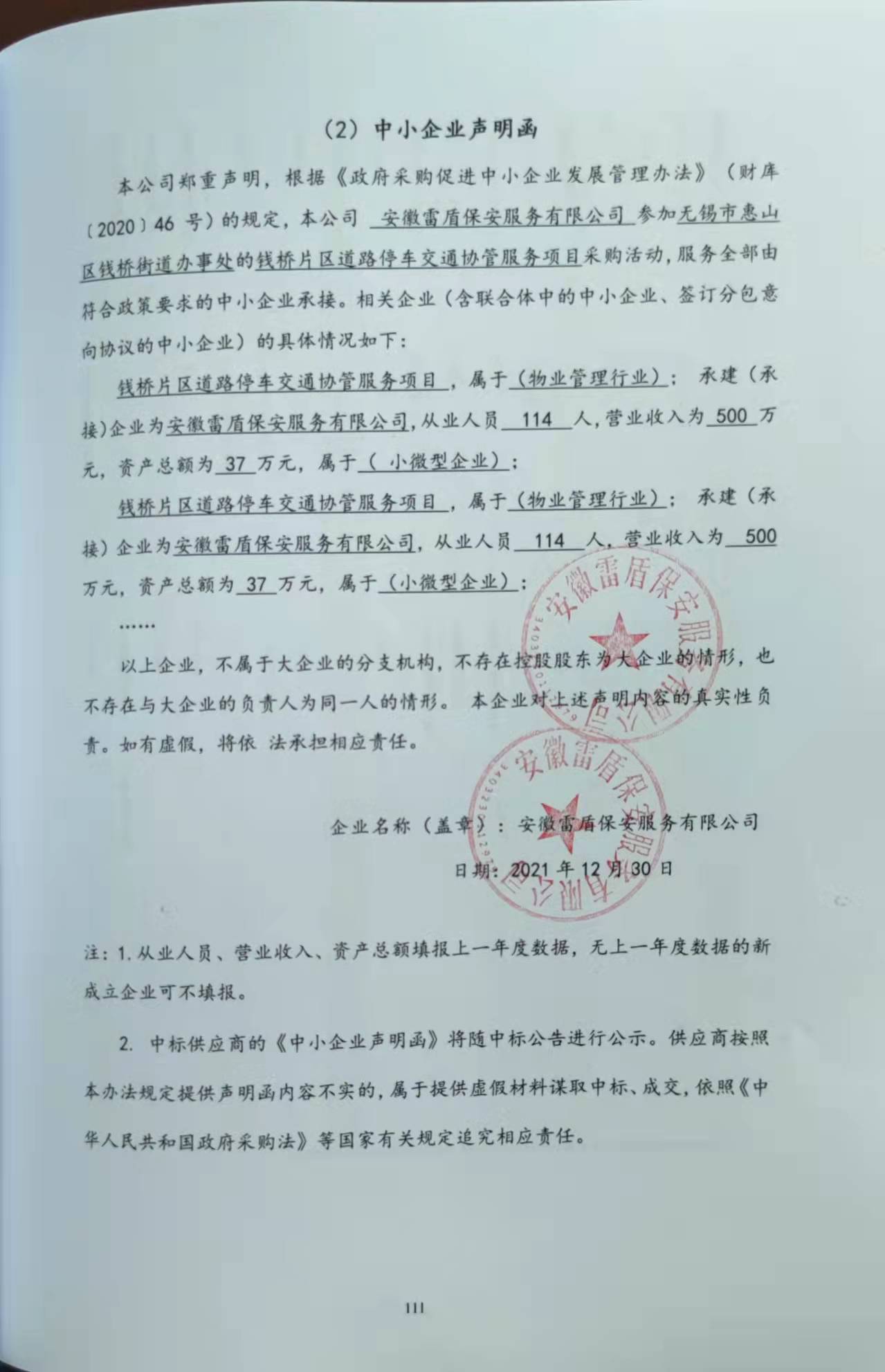 | 1 | 钱桥片区道路停车交通协管服务项目 | 本项目为道路停车协管服务,为了进一步优化停车秩序,提高道路通行效率,保障道路交通有序、安全、畅通,现对钱桥片区实行道路停车协管服务。主要包括:停车现场秩序维护、停车现场安全维护、规范车辆停放、综合保障等 | 不限 | 批 | 报价:***(元) | 安徽雷盾保安服务有限公司 | 安徽省蚌埠市固镇县城关镇农资大市场10号楼2单元 | 91340323MA2UGQEY38 |