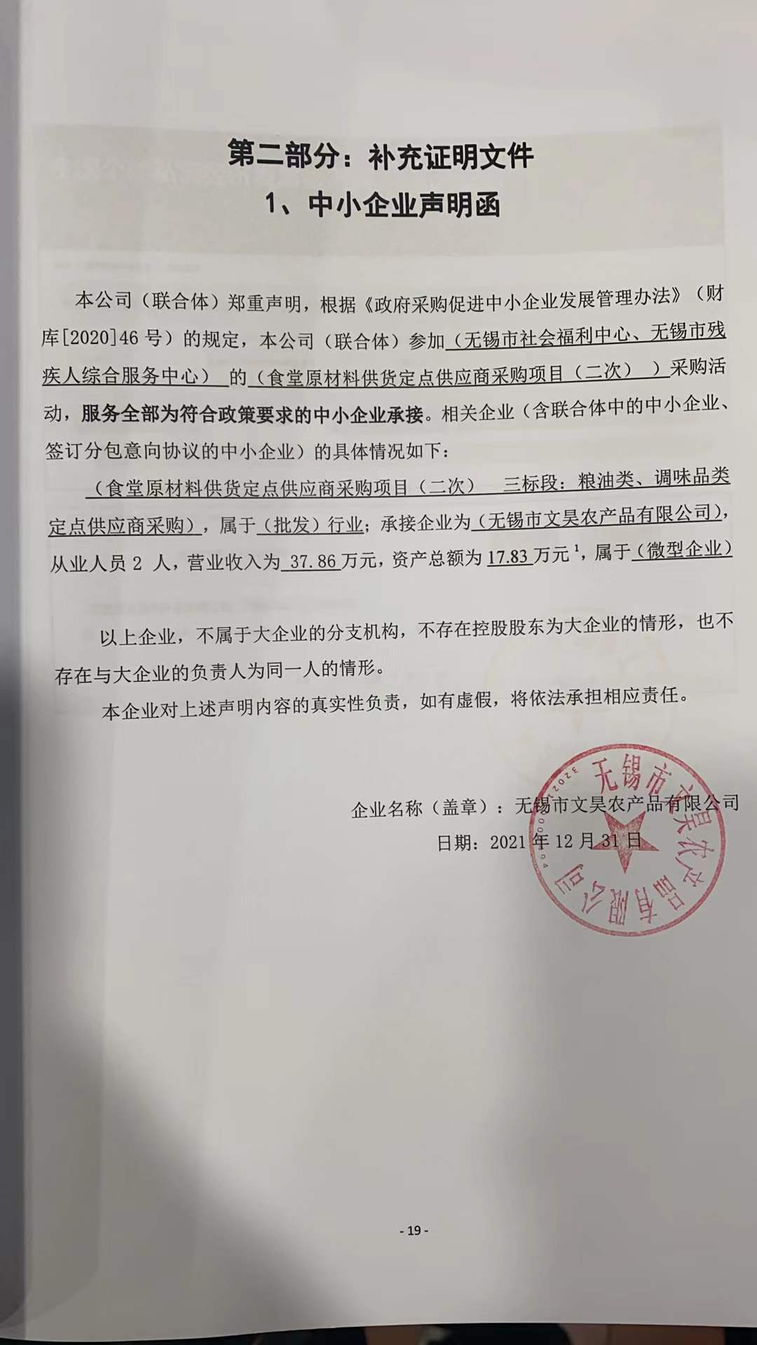 | 1 | 粮油类、调味品类定点供应商采购 | (1)项目概况:食堂原材料供货定点供应商采购,本项目设1个标段: 三标段:粮油类、调味品类定点供应商采购; (2)服务期限:1年; (3)质量要求:满足采购文件及采购需求; (4)定点单位数量为:每个标段均为1家单位。 (5)本项目预算价:***万元(包含三个标段,其中三标段预算价***万元,具体按实结算)。 (6)本项目所属行业:餐饮业 (7)本项目是否专门面向中小企业:否。 | 1 | 年 | / | 报价:***(%) | 无锡市文昊农产品有限公司 | 无锡市滨湖区独月路50号 | 91320211MA1N43P921 |