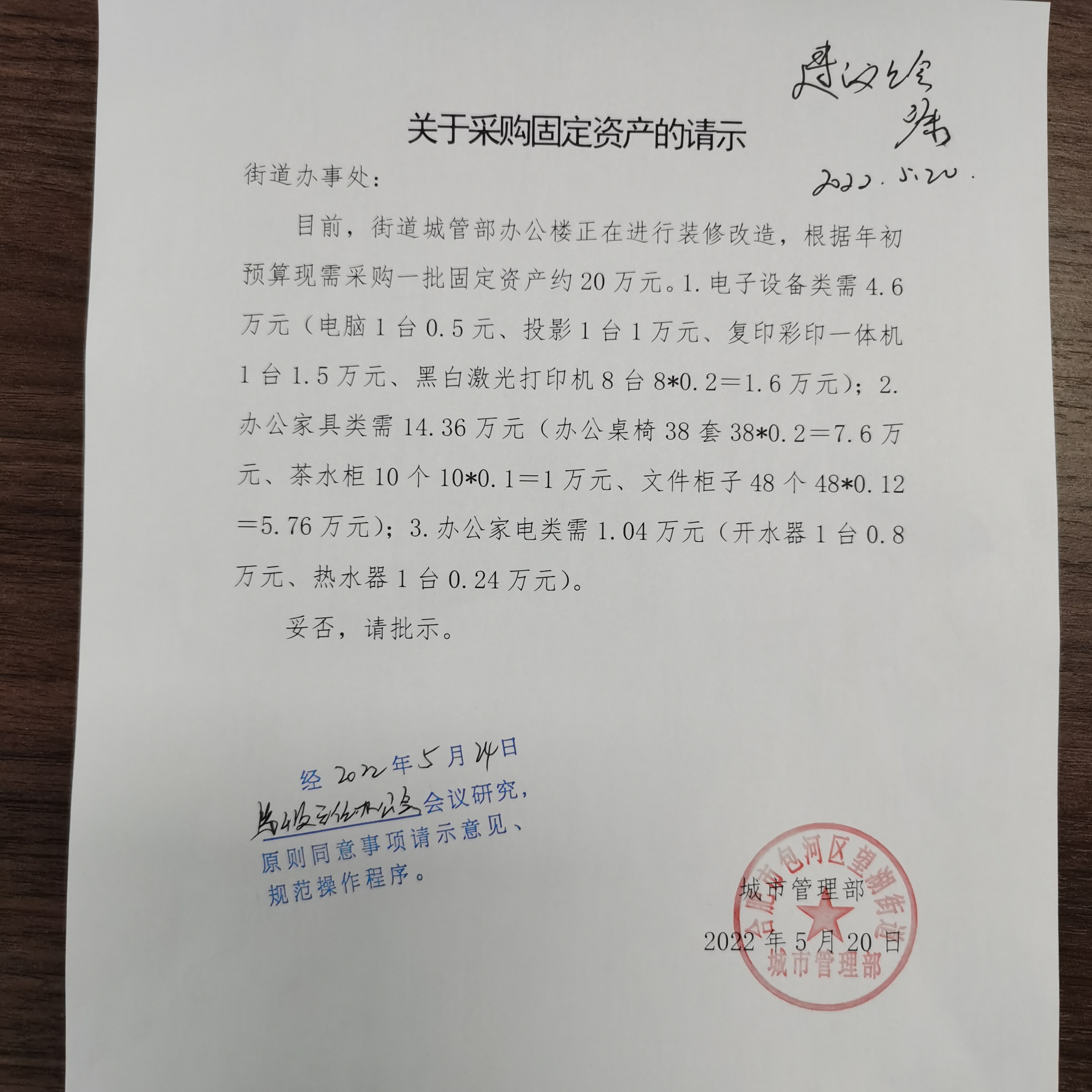 | 1 | 城市管理部办公家具采购 | 为了保证城市管理部办公楼装修结束后尽快投入使用,根据年初预算现需采购一批固定资产,其中办公桌椅***套,每套2000元,小计76000元;茶水柜10个,每个1000元,小计10000元;文件柜48组,每组1200元,小计57600元,以上费用合计***元。 | *** | 2022年07月 | 资产采购 |