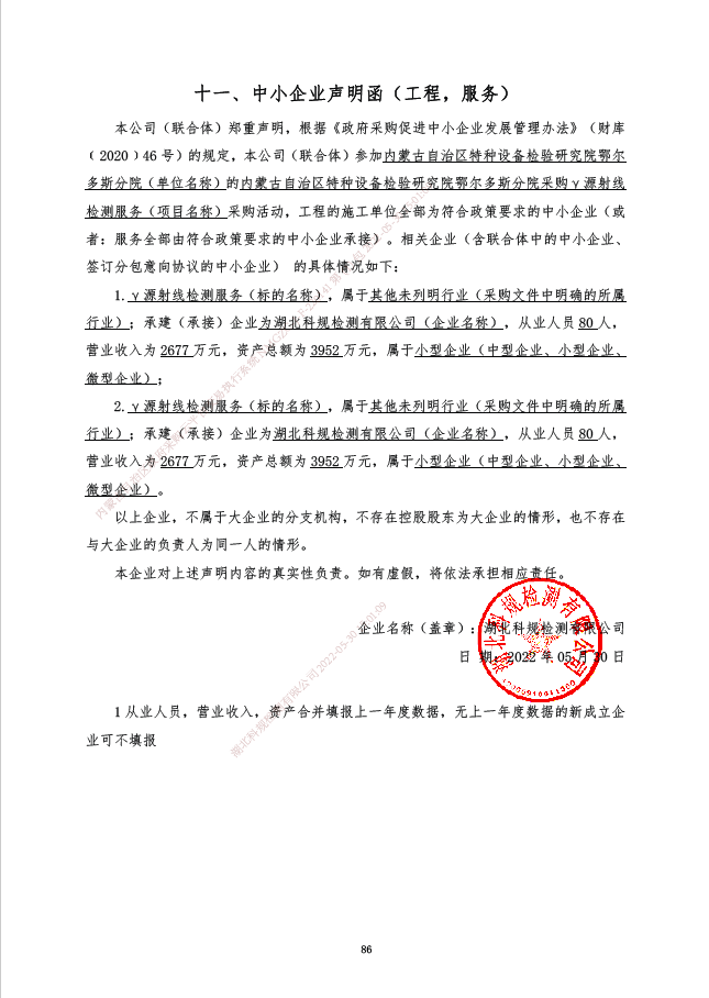 | 1-1 | 其他专业技术服务 | γ源射线检测服务 | 为采购单位提供拍摄3万张片的服务。按项目参数制定详细的无损检测工艺文件。 | 严格按照招标文件参数要求验收 | 签订合同后提供服务期限为12个月的服务 | 严格按照招标文件参数要求验 | *** |