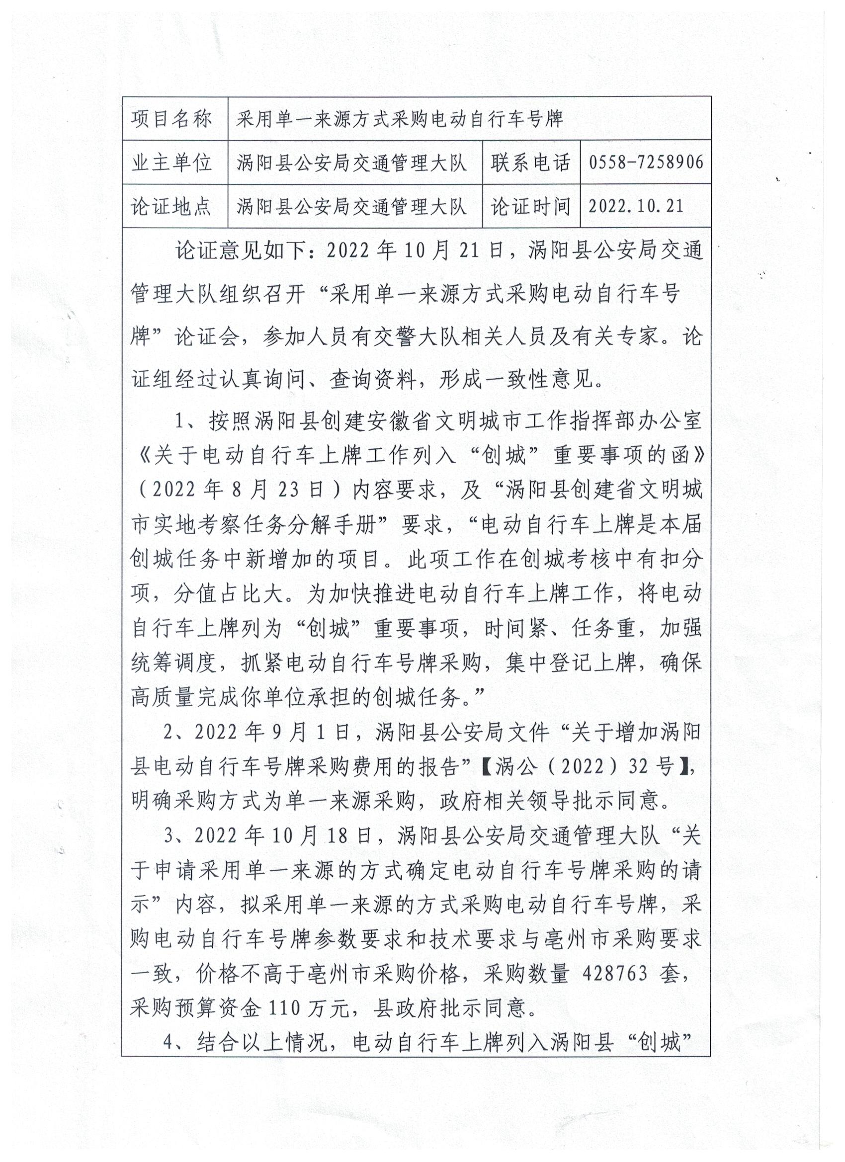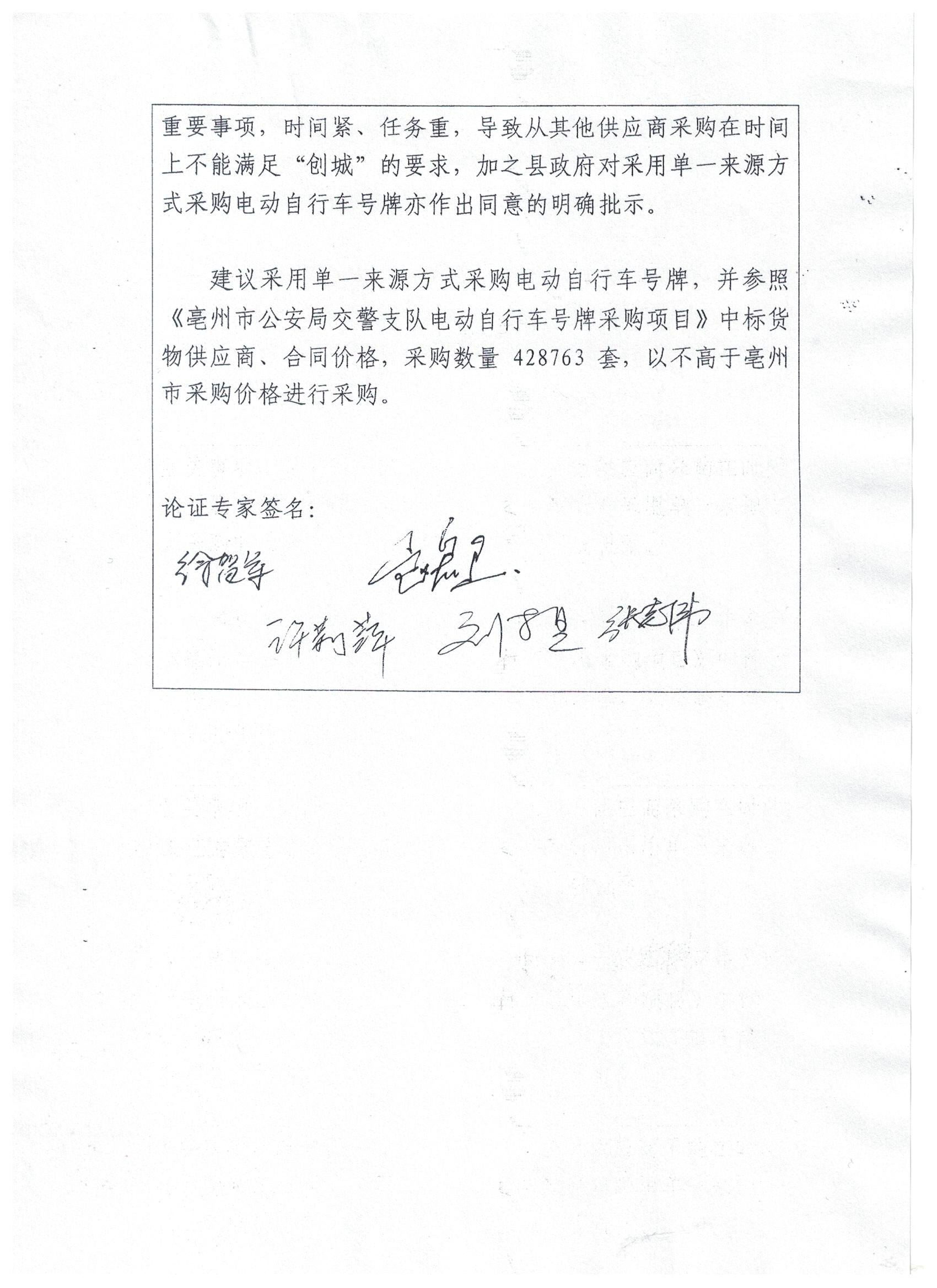 采用单一来源采购方式的原因及说明:本项目拟采购电动自行车号牌***因县创建文明城市指挥部把电动自行车上牌列为重要事项***时间紧***任务重***导致从其他供应商采购在时间上不能满足“创城”的要求。县政府对采用单一来源方式采购电动自行车号牌亦做出同意的批示。经安徽省综合评审专家库抽取的专家组论证***参照《亳州市公安局交警支队电动自行车号牌采购项目》中标货物供应商、合同价格***以不高于亳州市采购价格***采用单一来源采购电动自行车号牌。