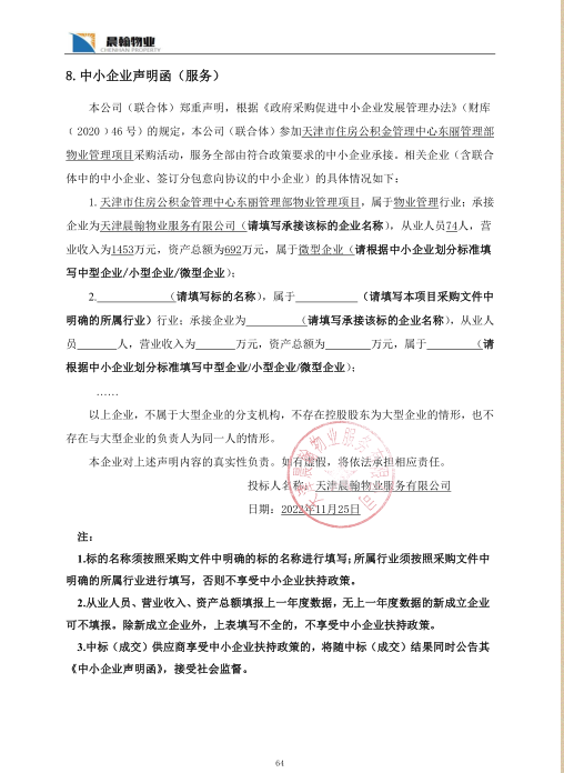 1.成交供应商名称:天津晨翰物业服务有限公司