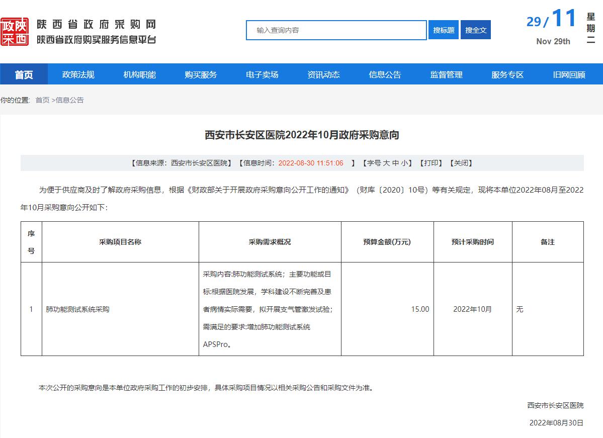 项目名称:西安市长安区医院肺功能测试系统采购项目