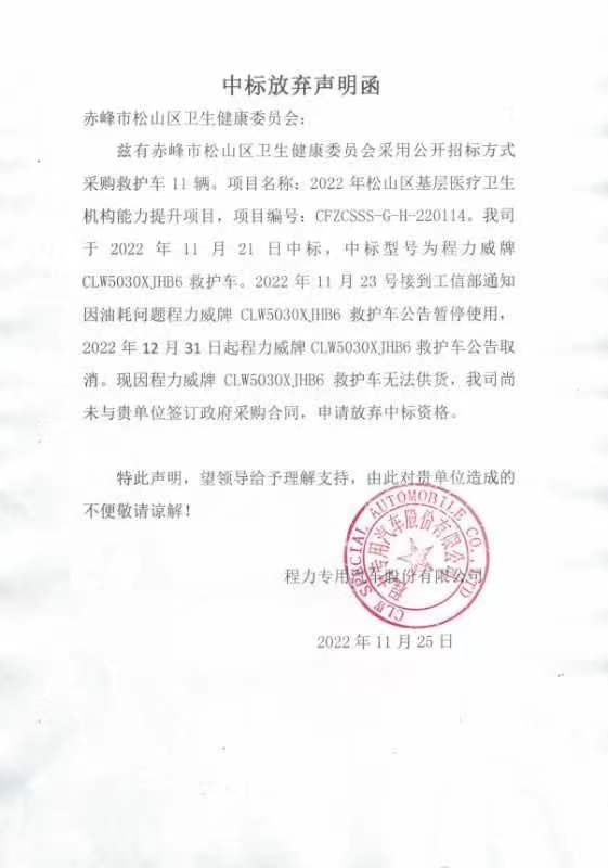 原公告的合同包4(4包(救护车))中标状态:中标***更正为:未中标。废标原因为:中标供应商程力专用汽车股份有限公司放弃中标资格。根据《中华人民共和国政府采购法实施条例》第四十九条的规定***决定重新开展本项目政府采购活动。